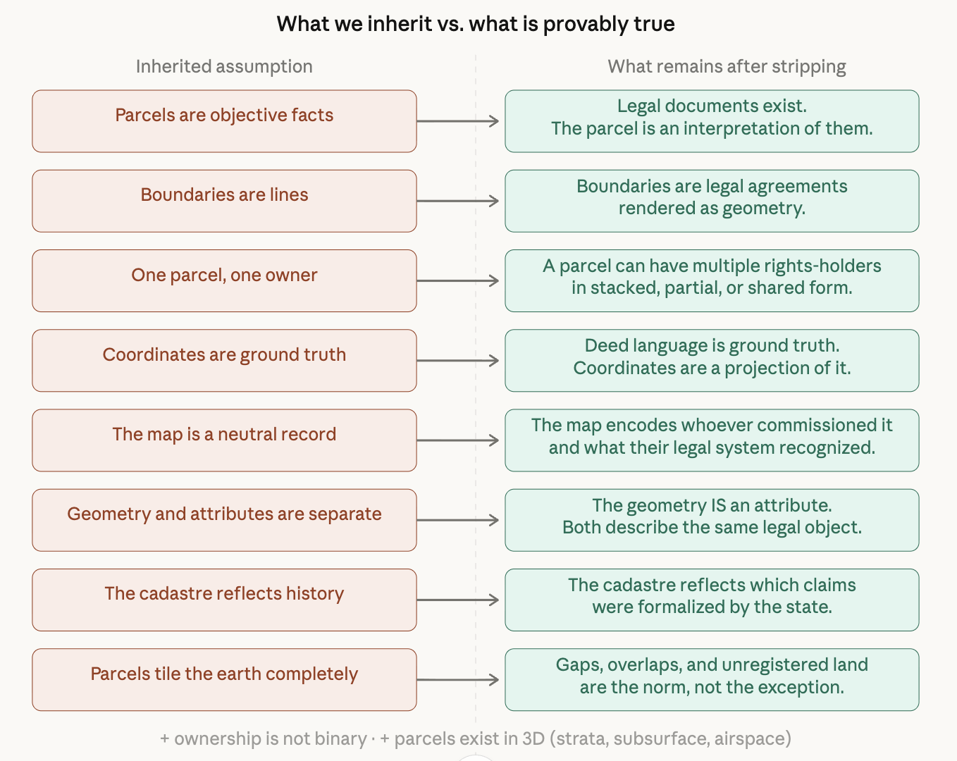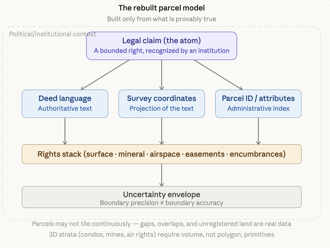 After stripping everything, what's left that's actually, provably true is surprisingly spare: human institutions create bounded claims over portions of the earth, those claims change over time, and they stack in multiple dimensions. Everything else — the polygon, the parcel ID, the owner field, the cadastral layer — is infrastructure built to manage those claims at scale. GIS inherited that infrastructure without fully inheriting the epistemological humility it requires.